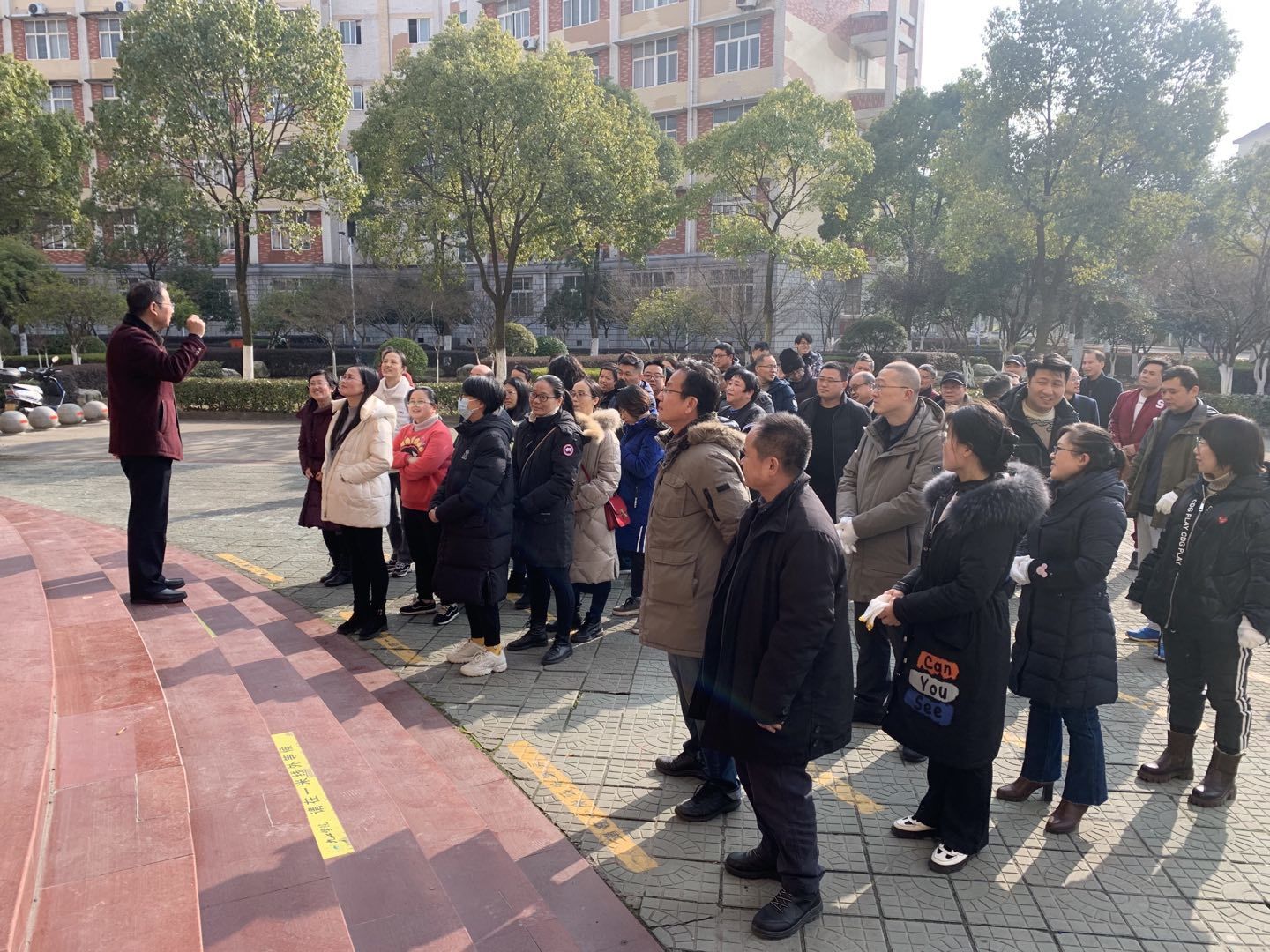 比赛过程中,场上教工喊着整齐的口号,齐心协力,拼劲十足,场下教工加油呐喊声响彻义丰楼广场。