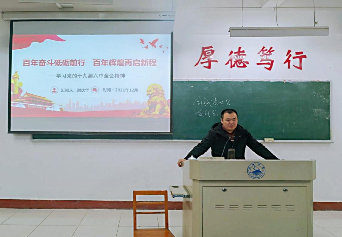 会议伊始,谢伏华结合PPT内容,具体地阐述了党的百年发展历程,系统梳理了党的十九届六中全会的“百年奋斗成就”“历史经验领悟”“战略部署赶考”三大环节。随后,结合中国实际情况,分析了六中全会的取得重大标志性成果的原因以及“两个确定”的重要指导意义。最后,呼吁全体同学积极顺应时代的潮流,增强自身优势,把握当下,迎接未来。