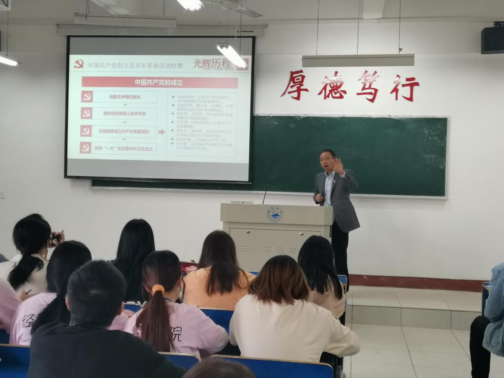 仪式结束后,党委书记漆晗东为大家带来题《重温中国共产党党史》的党史学习专题讲座。围绕中国共产党成立的背景和发展脉络,讲述了中国共产党的发展,分析和总结了党的百年奋斗历程。希望同学们要铭记革命历史,担当历史使命,激励青年学子知党恩、跟党走,传承红色基因,汲取奋进力量。