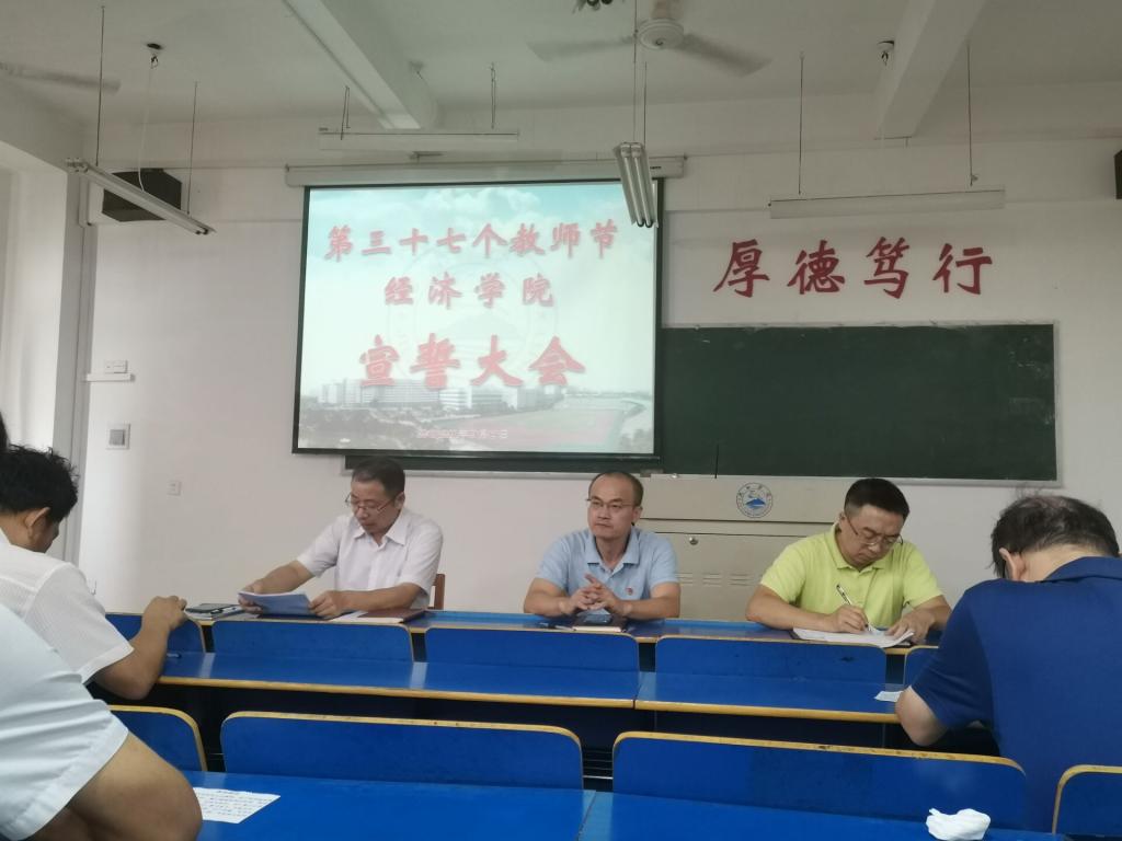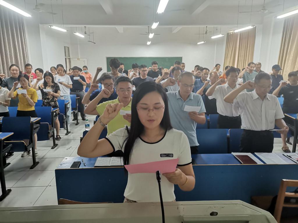 在学校立德树人楷模、国际贸易教研室张敏老师领誓言下,全体教师庄重宣誓:“我志愿做一名光荣的人民教师,忠于人民的教育事业,全面贯彻教育方针,恪守教师职业道德,树立科学教育发展观,育人为本,关爱员工,为人师表,弘扬正气,传承文明,开启智慧,积极面对生活,终身学习,开拓创新,淡泊名利,爱岗敬业,为人民的教育事业奉献一切。”
