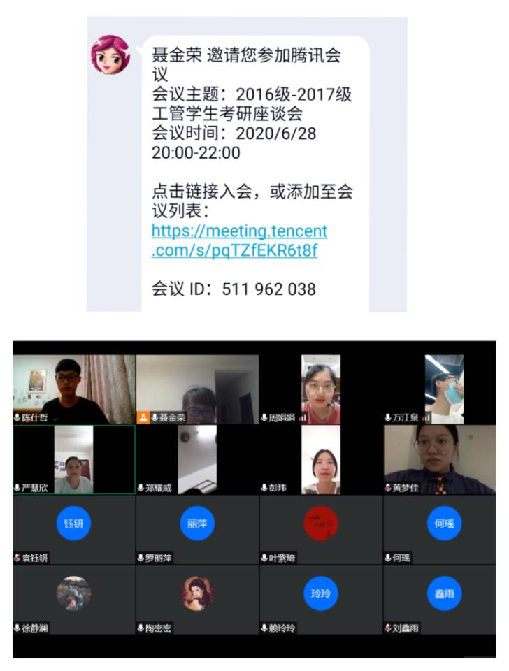 根据2017级工商管理专业员工考研备考过程中,很多同学处于茫然和困惑的情况下,2020年6月28日晚上八点到十点,班主任聂金荣老师主持了2016、2017级工商管理专业考研经验交流会。本次交流会采用腾讯视频会议,邀请了2016级工商管理专业郑耀威同学(录取浙江工商大学企业管理专业)、周娟娟同学(录取江西财经大学企业管理专业)、黄梦佳同学(录取华南师范大学企业管理专业)对学弟学妹传授考研经验。三位同学在自己的经验分享中分别一一详细解答大家的问题,三位同学如数家珍,娓娓道来,让2017级员工豁然开朗。