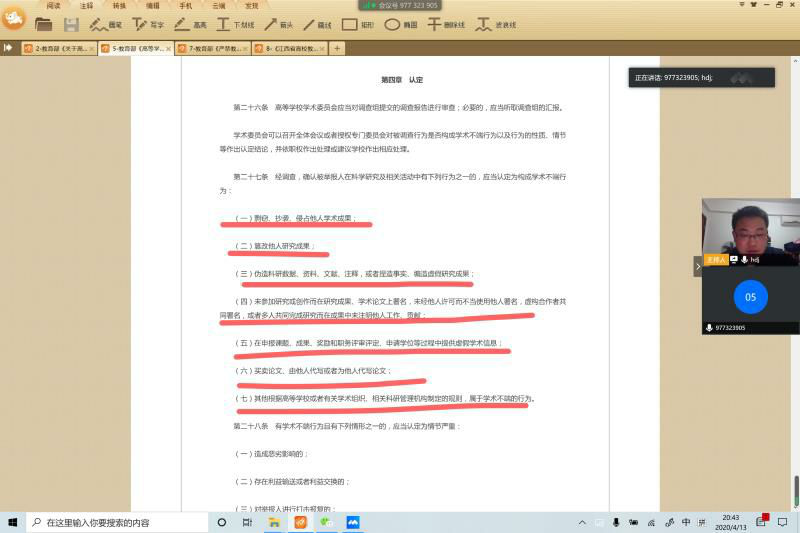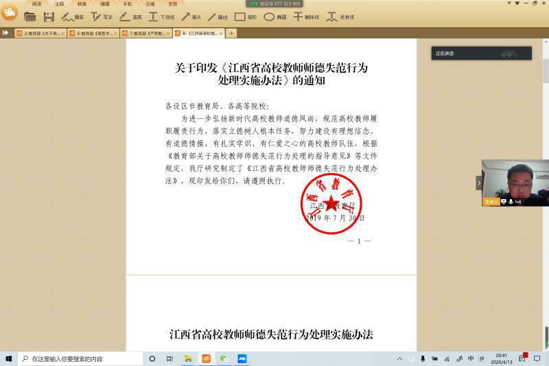 2020年4月13日晚,经管学院物流教研室全体教师在教研室主任的组织下,通过腾讯视频会议的方式学习“教育部、江西省有关高校教师师德师风系列文件”。