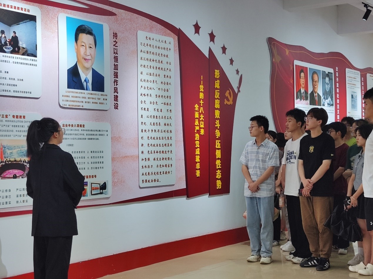 步步见廉景、处处闻廉语、时时受廉教。在工作人员的讲解下,大家仔细观看了反腐案件图片,了解了党的纪律建设历史回顾,学习了党的十八大以来全面从严治党成就卓著,观看了新时代反腐斗争成果,熟悉了党的二十大关于全面从严治党的新部署新要求。鲜活的腐败案例、发自肺腑的沉痛忏悔,让每一位同学深刻认识到了违纪违法给党和国家事业造成的严重危害,真正让纪律和规矩内化于心、外化于行。