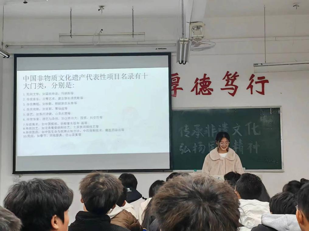 主持人根据PPT讲述中国成功申请非遗的种类,如打铁花、皮影戏、中国功夫、戏剧等,接着引出非遗文化中的精神。