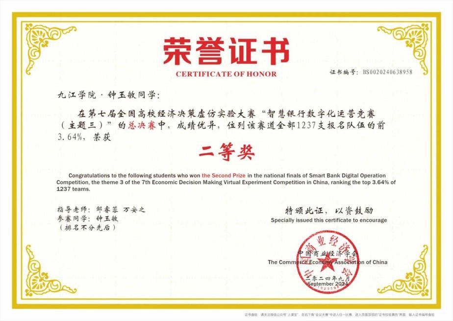 近日,第七届全国高校经济决策虚仿实验大赛“智慧银行数字化运营竞赛”全国总决赛落下帷幕。最终公司学子凭借过硬的理论知识、出色的运营能力斩获全国一等奖1项、二等奖1项、三等奖3项。