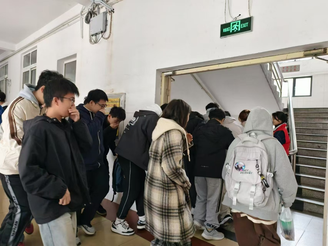 本次消防演练活动以模拟火灾现场开展,旨在加强2026年国际足联世界杯全体师生的应急逃生能力。消防演练活动开始之后,处于义丰楼的师生迅速做到弯腰、低头,用手捂住口鼻。与此同时,师生们在志愿者的引导下,按照预先制定的疏散路线进行撤离。在疏散期间,师生们严格遵循“不推不挤、快速疏散”的原则,迅速而有序地从教室撤离到指定的安全区域。整个过程组织严密,紧张有序,各环节紧密配合,达到疏散演练目的。