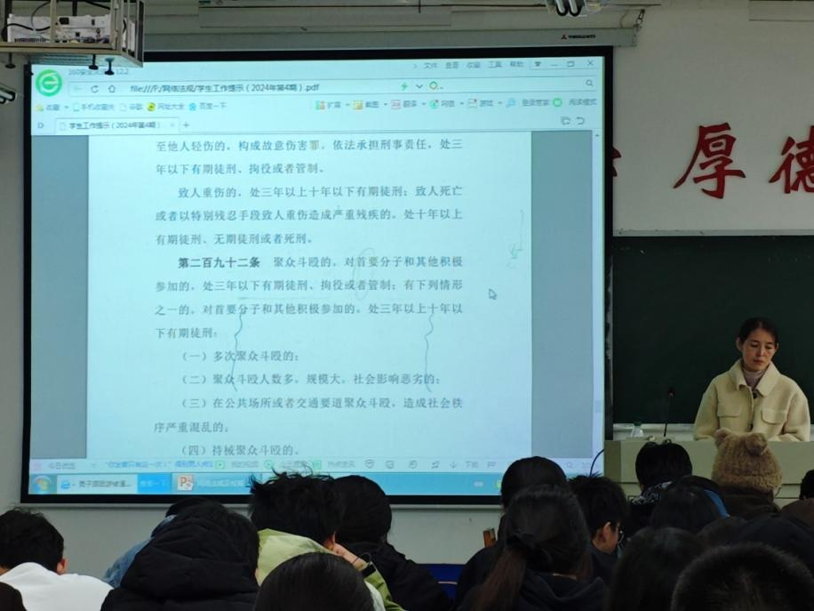 紧接着,各位班主任老师为同学们解读了有关互联网信息浏览、传递的相关法律法规,并重点强调了学校对员工“虚假信息”传播等违纪违规行为的处分管理规定。通过专题教育,让同学们更进一步明确了在虚拟网络空间维护和行使自身的权利,规范个人行为的重要性。活动最后,学院向同学们发出了依法上网、绿色上网、文明上网、安全上网的倡议,呼吁同学们提高法治素养,共同营造良好网络环境。