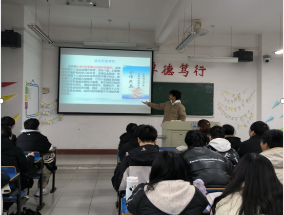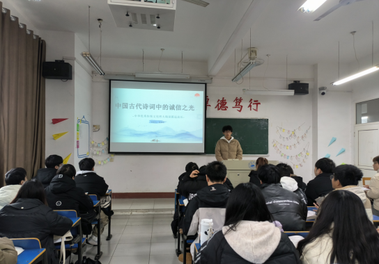 课中顾艳辉老师选取员工代表展示PPT并进行演讲,员工代表吕伯云同学以《中国古代诗词中的诚信之光》为演讲题目首先说明了诚信的重要性,其次生动地讲解了中国古代描述诚信的相关诗词,最后进行总结,希望每位同学都做到诚实守信,珍视自己的个人信用记录。