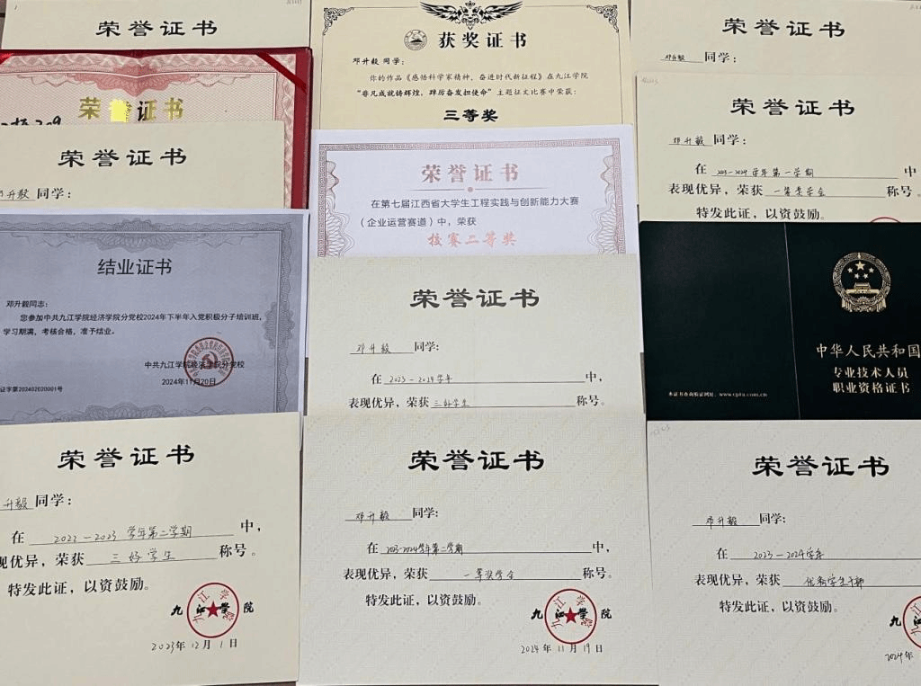 邓升毅,现任经济A2223班班长,在校期间荣获国家奖学金、校级一等奖学金,多次被评为“三好员工”“优秀员工干部”。他在第十六届全国老员工数学竞赛(非数学B类)中获得省二等奖,在第七届全国老员工工程实践与创新能力大赛(企业运营赛道)中获得校二等奖。同时,他考取了会计专业技术资格证书(初级)和计算机二级证书,并积极参加各类社会实践和志愿服务活动。