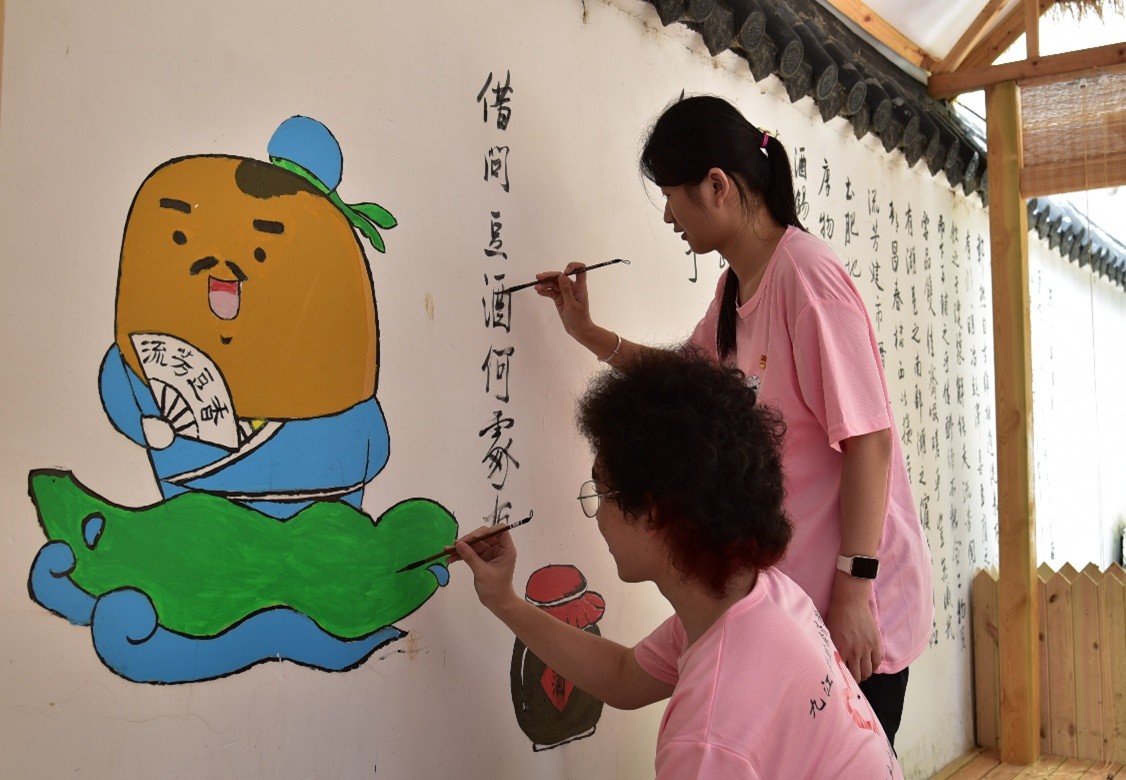 随后,在深入调研当地文化特色后,志愿者们将推普工作与当地独具特色的"豆色文化"相融合。通过结合田书法楹联的艺术魅力、乡规民约的教化功能以及非遗文化的传承价值,团队精心设计并绘制了一系列富有地方特色的推普墙绘和宣传标语。这些作品既保留了传统文化的精髓,又注入了推广普通话的时代内涵。