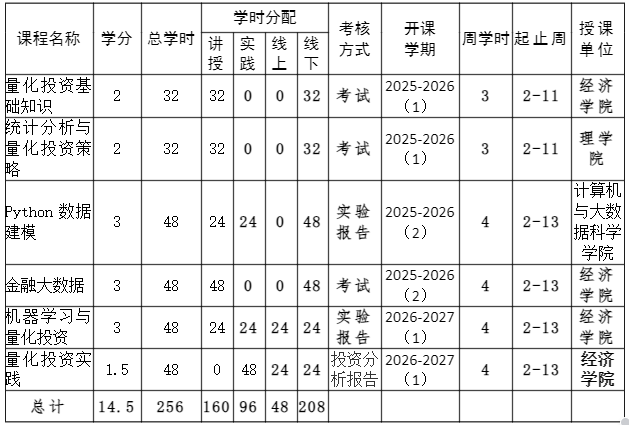 本专业涵盖了金融市场基本理论、数据分析与建模、金融产品定价、投资组合优化、风险管理和金融工程等多个领域,课程包括:量化投资基础知识、统计分析与量化投资策略、Python数据建模、金融大数据、机器学习与量化投资、量化投资实践共6门课程。课程注重理论与实践的结合,员工需修完13个学分。