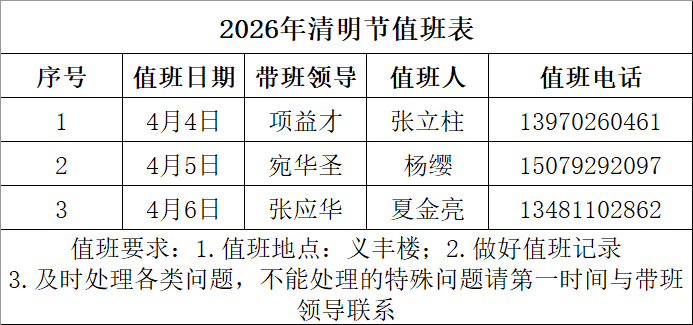 2026年清明节值班表与2026年上班年周末值班表详见附件