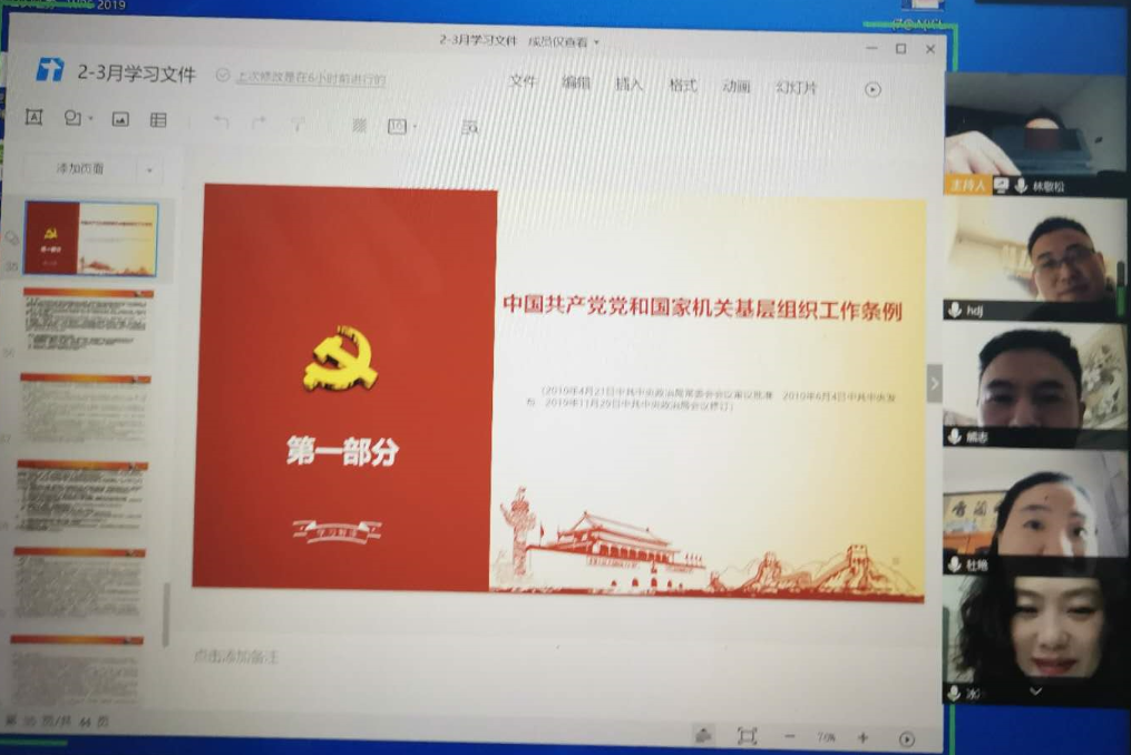 按照经管公司党委部署要求,3月18日,经管学院教工第四党支部党员在家召开腾讯视频会议,学习习近平总书记近期疫情防控重要讲话精神,《2019—2023年全国党政领导班子建设规划纲要》、《党委(党组)书记抓基层党建工作述职评议考核办法(试行)》、《中国共产党党和国家机关基层组织工作条例 》。此次会议由林敬松同志主持,教工四支部党员参加了此次网络视频会议。