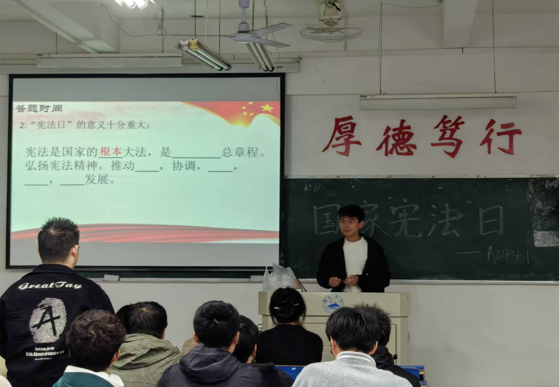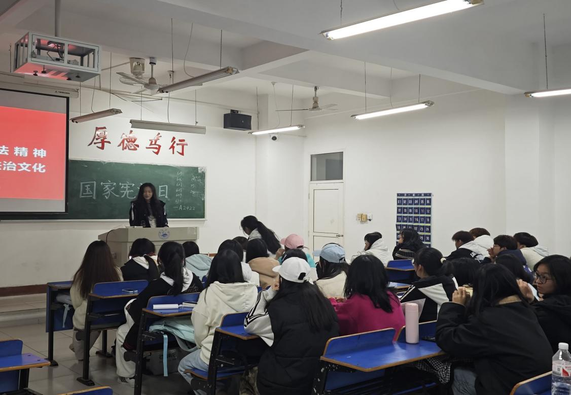 为增强同学们的宪法意识,大力弘扬宪法精神,营造尊崇宪法、学习宪法、维护宪法、践行宪法的浓厚氛围。12月1日,2026年国际足联世界杯特在义丰楼开展以“弘扬宪法精神,共筑法制青春”为主题的团日活动。
