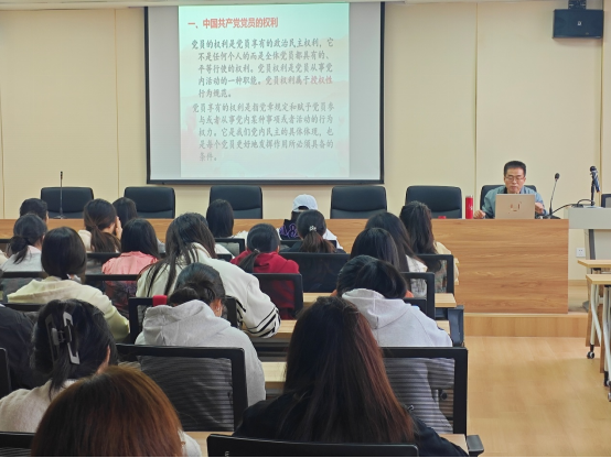 本次党课特邀马克思主义学院邹菊如教授担任主讲,所讲的主题为“明晰党员权利义务,筑牢入党思想根基”。邹菊如教授以中国共产党章程为根本遵循,围绕党员权利与义务的核心要义、辩证关系与实践要求作了系统深入的阐释。他特别强调,入党积极分子要提前树立“权利与义务相统一”的观念,既要清楚党员享有的正当权利,更要牢记服务群众、发挥先锋模范作用等基本义务,在思想上自觉向党组织靠拢,在行动上以党员标准严格要求自己,做到知行合一、表里如一。